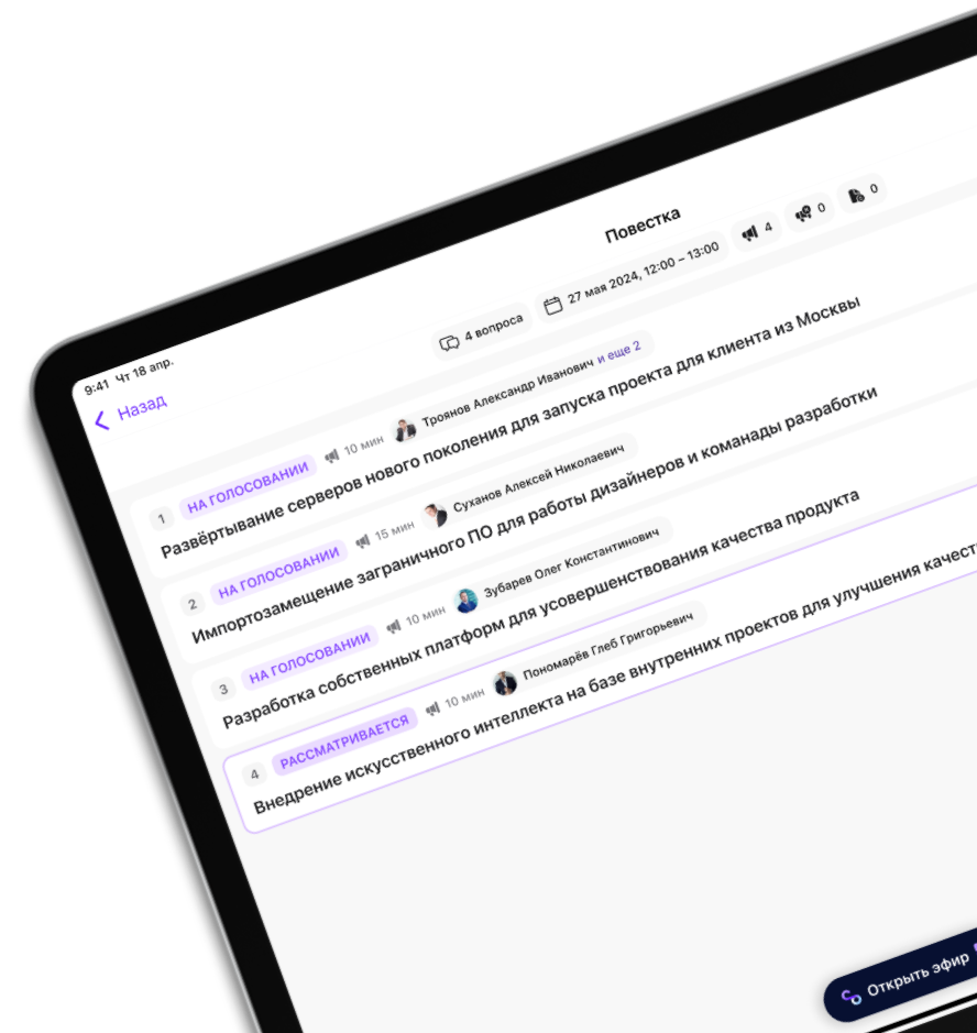 Голосуйте по результатам рассмотрения вопросов. Итоги заседания автоматически отразятся в протоколе, а поручения будут готовы для исполнения
